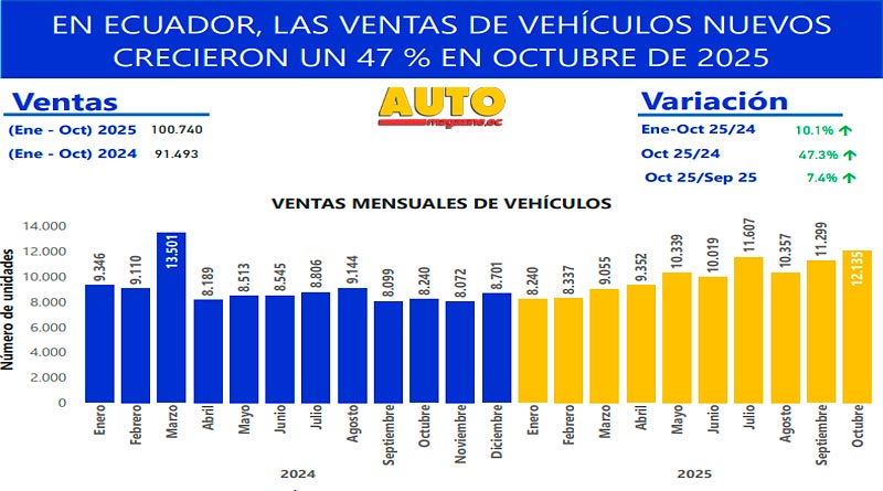 En octubre de 2025 se comercializaron 12.135 vehículos nuevos, lo que representa un crecimiento del 47% en comparación con el mismo mes del año anterior, cuando se vendieron 8.240 unidades. Este resultado convierte al pasado mes de octubre en el mejor de la historia para el mercado automotor nacional.