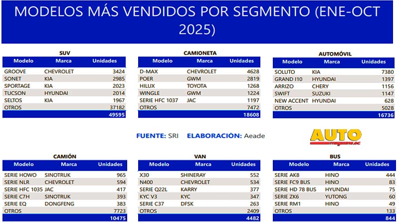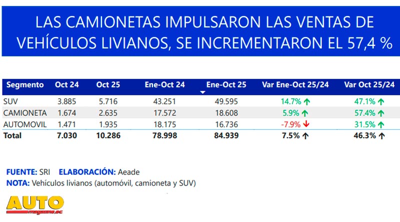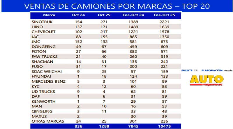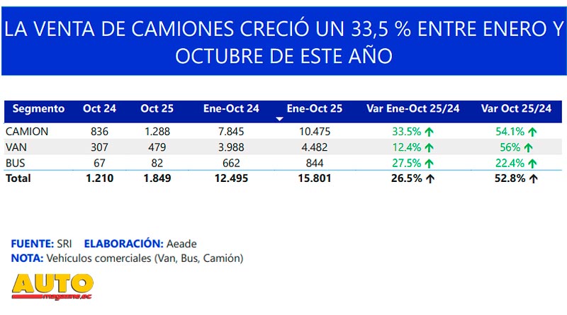 De acuerdo con el registro de facturas procesadas de vehículos nuevos reportado por el Servicio de Rentas Internas (SRI), en octubre de 2025 se registraron 1.370 unidades de vehículos pesados comercializados, esto es un 51,7% más que en octubre 2024.