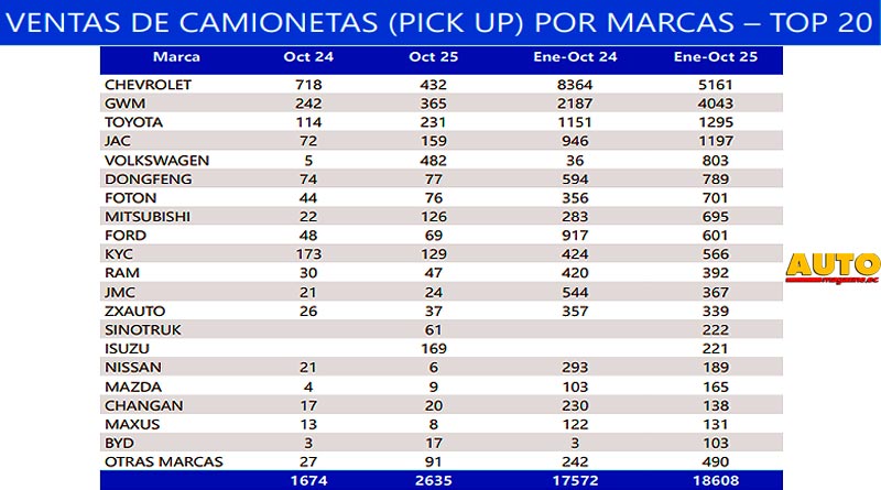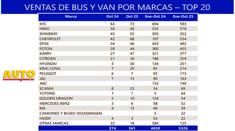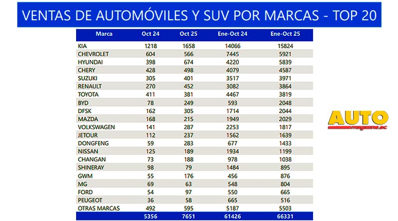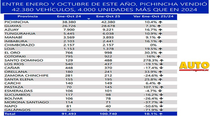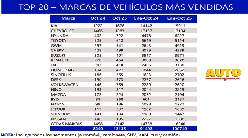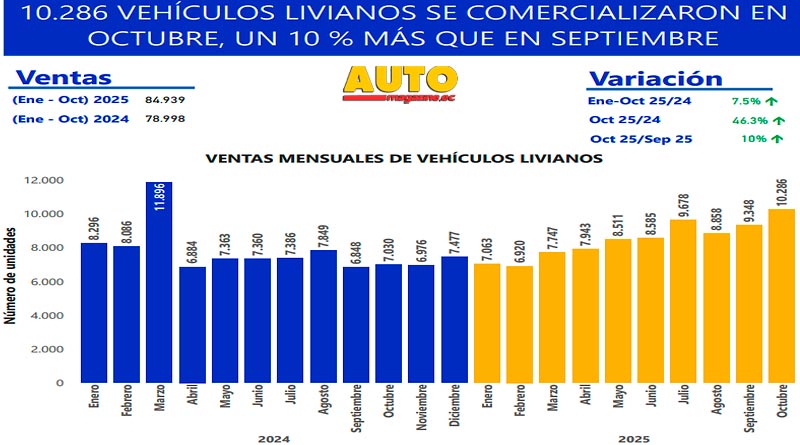 En el acumulado anual, entre enero y octubre de 2025 se comercializaron 100.740 vehículos nuevos, lo que representa un incremento del 10,1% frente al mismo periodo de 2024.