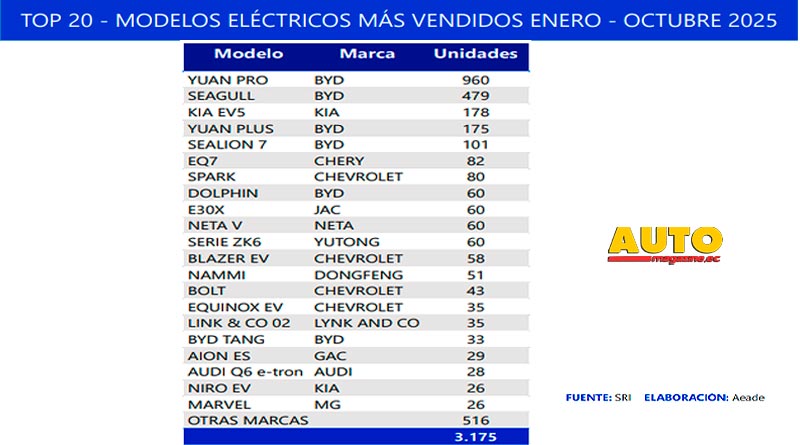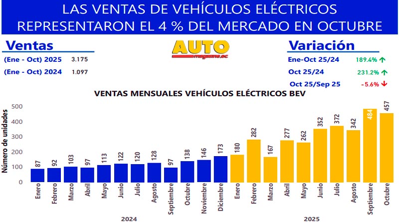 El mercado de vehículos electrificados, entre híbridos y eléctricos, también creció. Entre enero y octubre de 2025, la comercialización de vehículos eléctricos experimentó un alza del 189,4% interanual, alcanzando las 3.175 unidades. Mientras que, los vehículos híbridos alcanzaron 14.973 unidades vendidas, lo que representa un aumento del 37,4% en el mismo periodo.