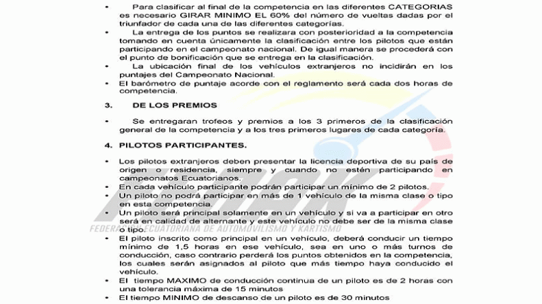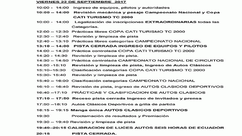 Para el efecto, la Federación presentó ante los medios de comunicación especializados, los detalles que regirán estas actividades automovilísticas; esto es, los Cronogramas (arriba) con los que se desarrollarán los dos días, y el Reglamento Particular de las “6 Horas”, que a continuación exponemos: