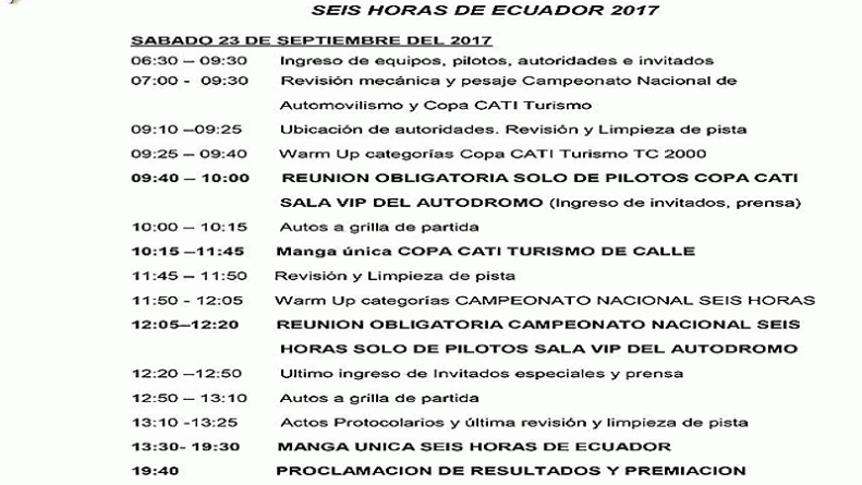 Se trata de, la Tercera Válida del «Campeonato Nacional Classic & Retro Endurance Yahuarcocha 2017« de Autos Clásicos Deportivos, que se correrá en el Autódromo Internacional de Yahuarcocha el viernes 22 de septiembre; y, el principal evento tuerca de circuito del país, las “6 Horas de Ecuador”, que ha venido cumpliéndose como una competencia de caracter internacional, en la que se puntuará también como Sexta Válida del Campeonato Nacional de Circuito, y que se desarrollará a día seguido en el mismo escenario imbabureño, esto es el sábado 23 de septiembre, fecha en que, previamente, en horas de la mañana, se correrá también la Cuarta Válida de la Copa CATI TC 2000.