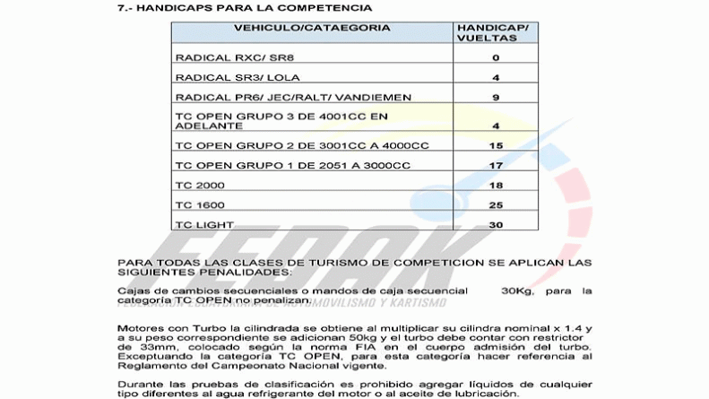 Un detalle importante que se destacó en la rueda de prensa y que consta en el reglamento (pag. 5), es que se aplicará Handicaps por categorías para esta competencia, a fin de equipararlas y permitir que cualquier piloto de cualquiera de ellas pueda tener verdaderas opciones de ganar la competencia en la «General». Los organizadores aclararon que, cada piloto solo puede alternar en un vehículo por categoría global (2) durante las 6 horas de competencia.