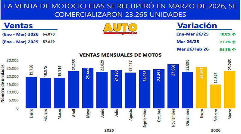Esto, en porcentajes representa un 10,8% de incremento en el primer trimestre de 2026, en comparación al mismo período de 2025; mientras que de marzo del año pasado a marzo del presente año el crecimiento de las ventas representa el 21,7% y en marzo del presente año ese crecimiento significa un incremento del 56,8% en relación a las ventas de motos en el deprimido mes de febrero pasado.