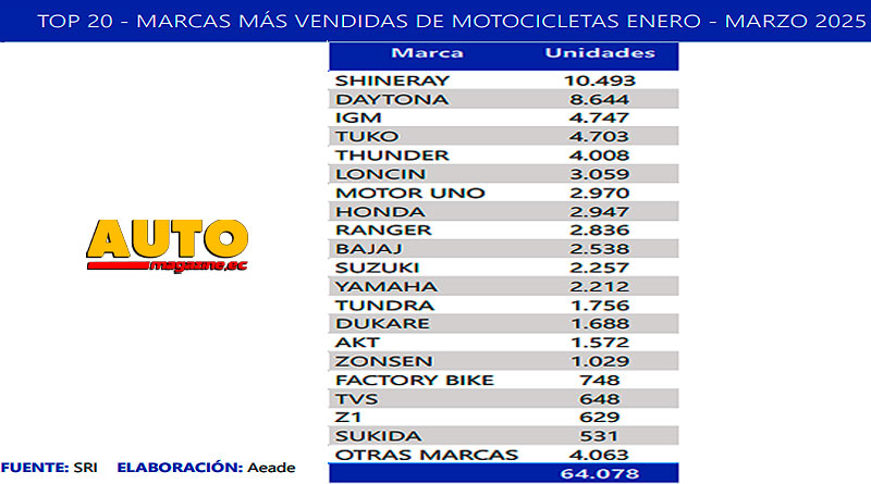 Según cifras entregadas por la AEADE, Asociación de Empresas Automotrices de Ecuador, basadas en la facturación registrada por el SRI, Servicio de Rentas Internas, en Ecuador la venta de motos, luego de una considerable caída en febrero, presenta una importante recuperación al cierre del mes de marzo.