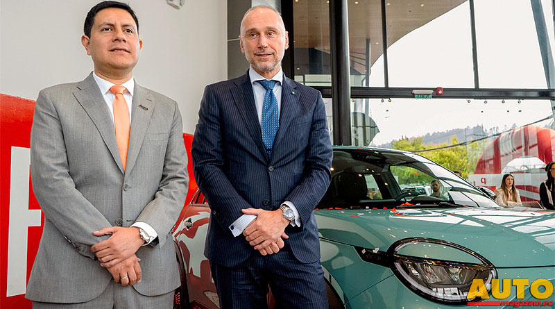 Pablo Burbano, Gerente de Unidad de Negocio de Maresa; y Giovanni Davoli, Embajador de Italia en Ecuador, con el nuevo Fiat 600 HEV