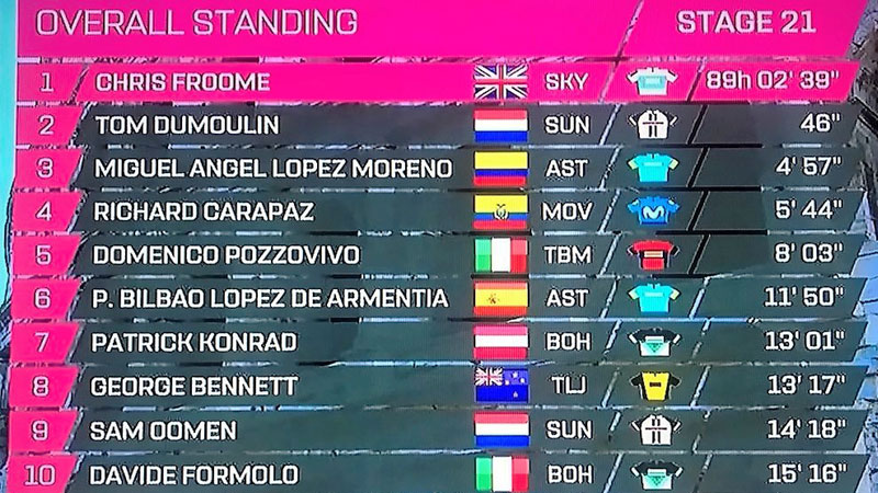 Carapaz extendió en esta edición la racha de triunfos parciales de los telefónicos hasta ocho años consecutivos y logró prolongar un guarismo que habla muy a las claras sobre la implicación que Movistar Team siempre tiene para con el Giro: por quinta temporada seguida, un ciclista del conjunto de Eusebio Unzué -representado en esta edición por Betancur (15º), De la Parte, Fernández, Pedrero, Dayer Quintana, Sepúlveda y el lesionado Rafa Valls– termina en el top-5 de la general, tras Quintana -ganador en 2014; 2º en 2017-, Valverde -3º en 2016- y Amador -4º en 2015-. (Movistar)